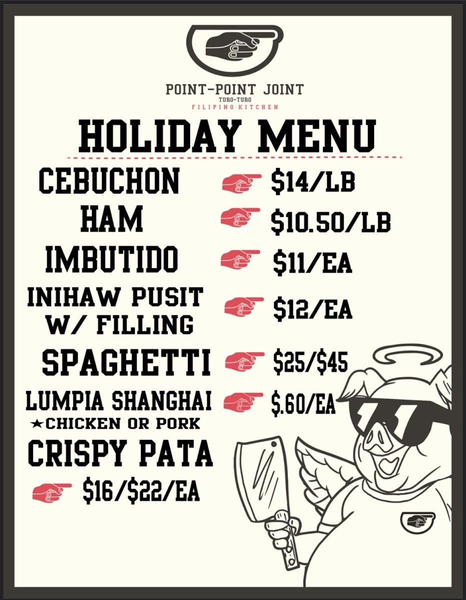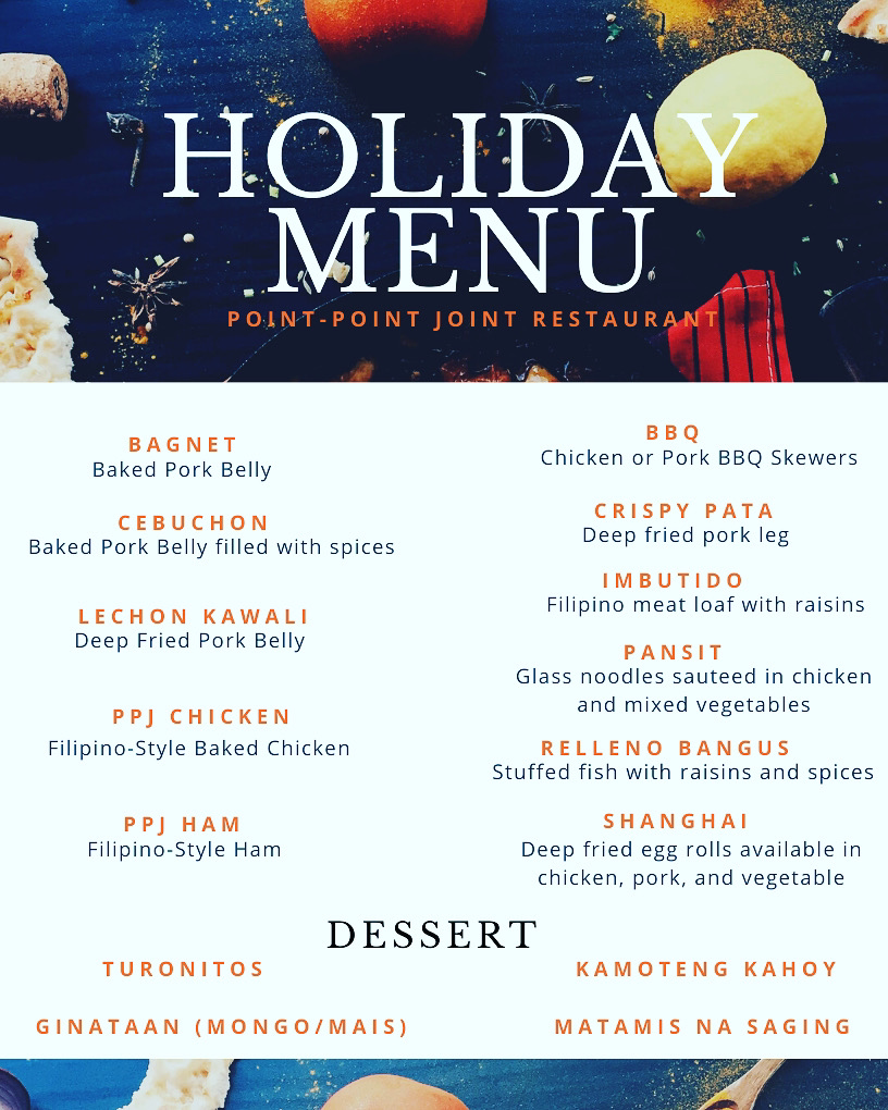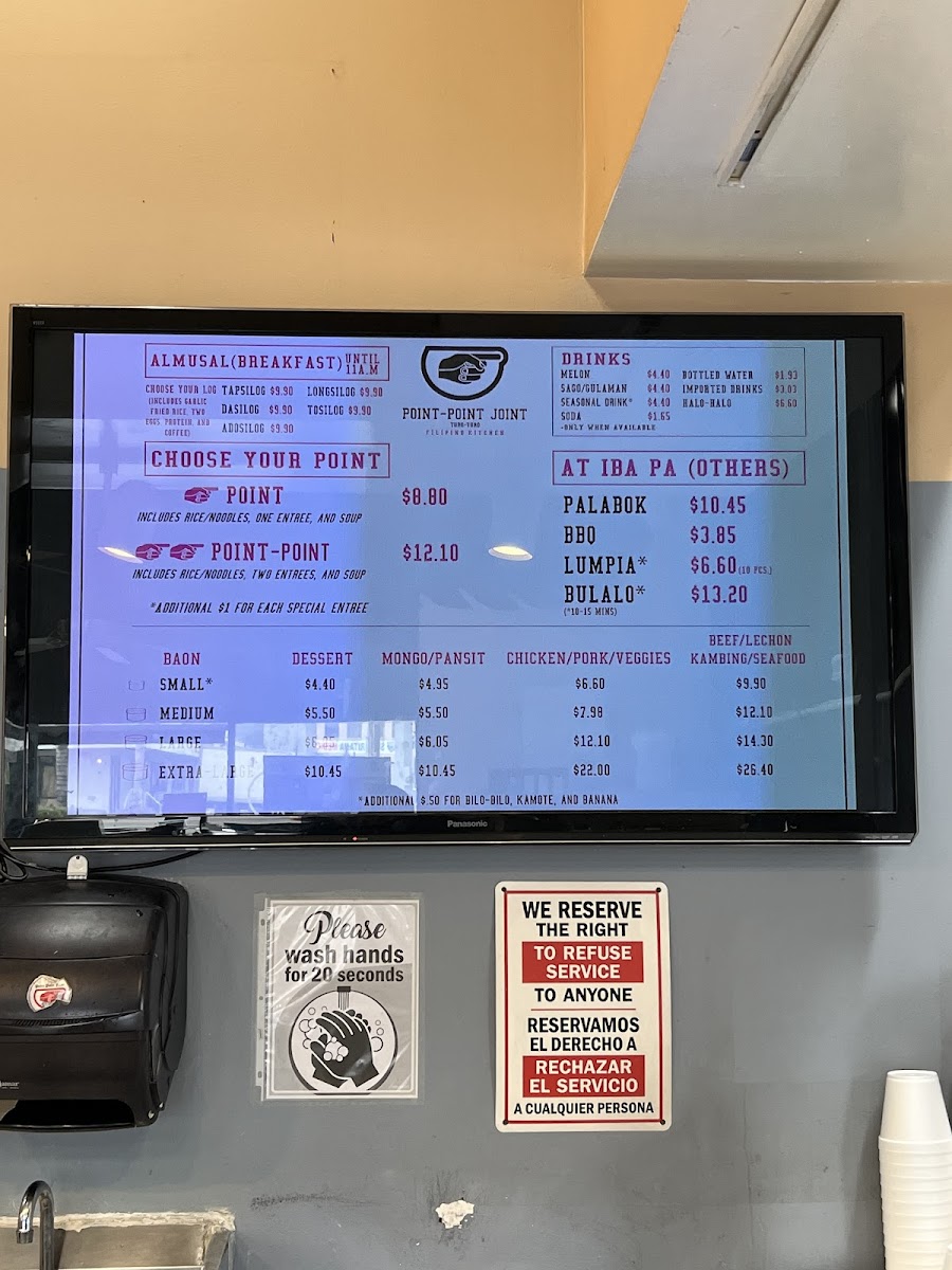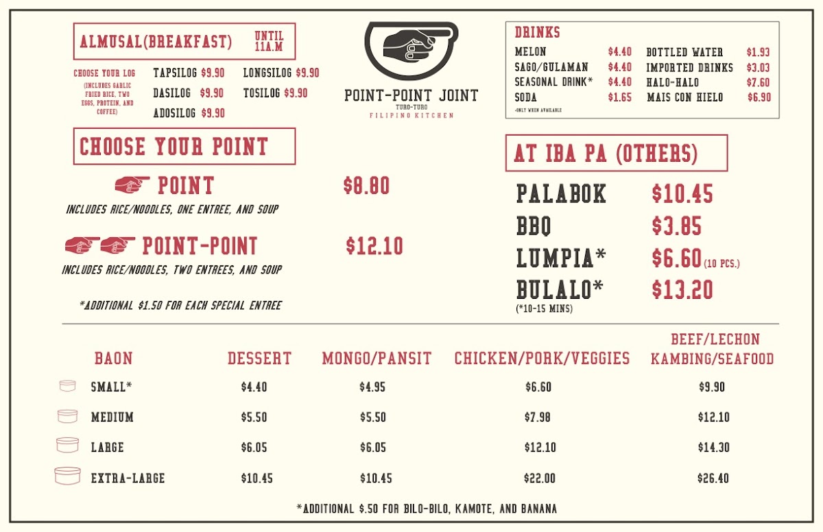 The menu at Point-Point Joint offers a delightful variety of Filipino-inspired dishes that cater to all tastes. The Extras section includes flavorful options like the BBQ Skewer, Bangus, and Pancit Of The Day, complemented by sides such as Atchara and Jasmine White Rice. For those craving something special, the Specials menu features dishes like the savory Lechon Sisig, crispy Tocino Fries, and comforting Soup Of The Day. The Dessert selection is a sweet treat with options such as Milo Float, Royal Float, and traditional favorites like Saba Con Hielo and Buko Pandan, with the beloved Halo-Halo rounding out the choices. If you're in the mood for something custom, you can even Build Your Point, with creations like Point and Point Point Point. The Beverages menu offers refreshing drinks including Apple C2, Melon Juice, and Thai Iced Coffee, as well as classic sodas like Sprite and Diet Coke. For breakfast lovers, the Breakfast section boasts hearty selections like Tapsilog, Longsilog, and the tasty Tocino Sandwich, providing a satisfying start to the day.